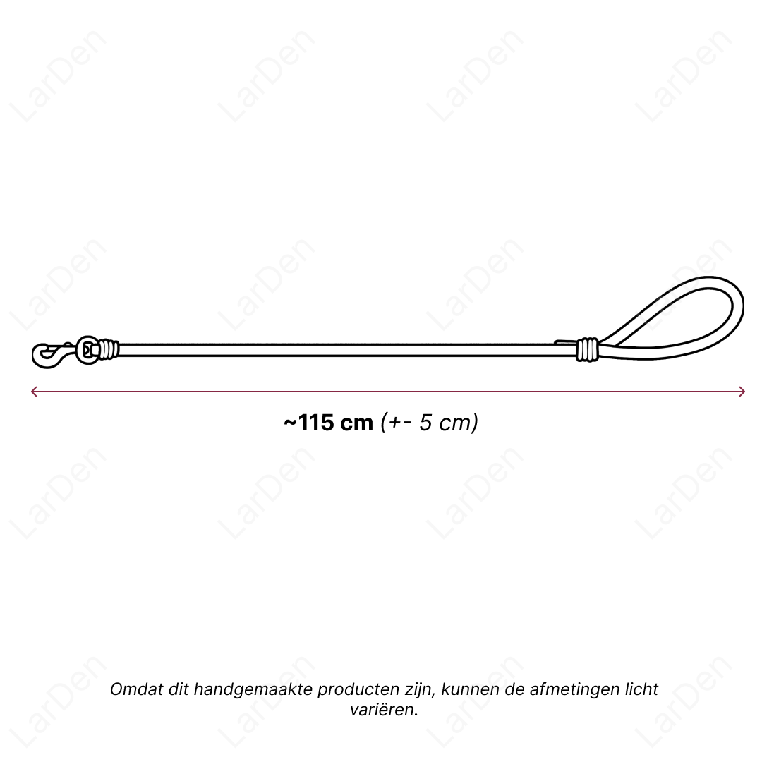 Onze LarDen teugels zijn ca. 115 cm lang en passen op alle Hobby Horses. Voor een beter beeld vind je de afmetingen aangegeven in de afbeelding.